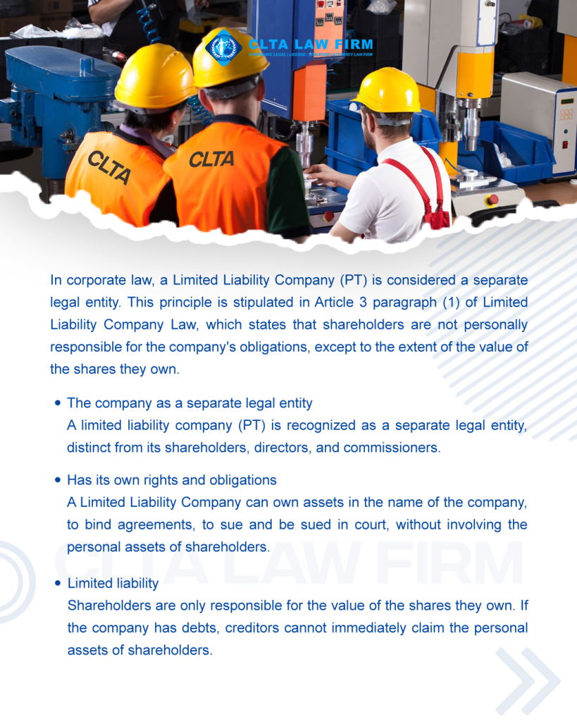 Dalam hukum perseroan, PT dipandang sebagai badan hukum yang berdiri sendiri. Prinsip ini diatur dalam Pasal 3 ayat (1) UU PT, yang menegaskan bahwa pemegang saham tidak bertanggung jawab secara pribadi atas kewajiban perseroan, kecuali sebatas nilai saham yang dimilikinya.